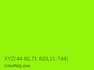 XYZ 44.92,71.623,11.744 Color is a normal green color and the nearest color is Spring Bud #a7fc00. Hex code #94f50a and RGB value is rgb(148,245,10). In RGB color space, this color is composed of 58% red, 96% green, 4% blue, In CMYK color space, this color is composed of 40% cyan, 0% magenta, 96% yellow , 4% black , In HSL color space, this color has a hue angle of 85° , 92% saturation and 50% lightness.