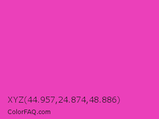XYZ 44.957,24.874,48.886 Color is a normal magenta color and the nearest color is Frostbite #e936a7. Hex code #eb40ba and RGB value is rgb(235,64,186). In RGB color space, this color is composed of 92% red, 25% green, 73% blue, In CMYK color space, this color is composed of 0% cyan, 73% magenta, 21% yellow , 8% black , In HSL color space, this color has a hue angle of 317° , 81% saturation and 59% lightness.