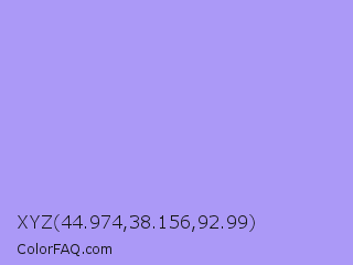 XYZ 44.974,38.156,92.99 Color is a light indigo color and the nearest color is Biloba Flower #b2a1ea. Hex code #ab99f7 and RGB value is rgb(171,153,247). In RGB color space, this color is composed of 67% red, 60% green, 97% blue, In CMYK color space, this color is composed of 31% cyan, 38% magenta, 0% yellow , 3% black , In HSL color space, this color has a hue angle of 251° , 85% saturation and 78% lightness.