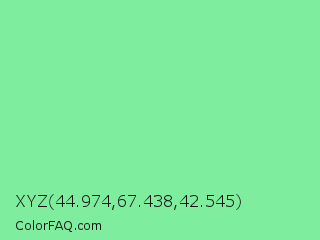 XYZ 44.974,67.438,42.545 Color is a light green color and the nearest color is Light Green #90ee90. Hex code #7eed9d and RGB value is rgb(126,237,157). In RGB color space, this color is composed of 49% red, 93% green, 62% blue, In CMYK color space, this color is composed of 47% cyan, 0% magenta, 34% yellow , 7% black , In HSL color space, this color has a hue angle of 137° , 76% saturation and 71% lightness.