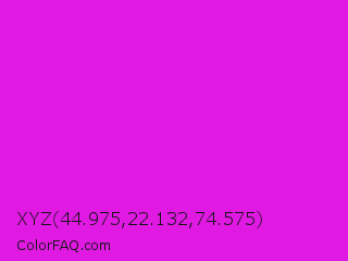 XYZ 44.975,22.132,74.575 Color is a normal magenta color and the nearest color is Hot Magenta #ff1dce. Hex code #e01ae3 and RGB value is rgb(224,26,227). In RGB color space, this color is composed of 88% red, 10% green, 89% blue, In CMYK color space, this color is composed of 1% cyan, 89% magenta, 0% yellow , 11% black , In HSL color space, this color has a hue angle of 299° , 79% saturation and 50% lightness.