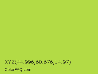 XYZ 44.996,60.676,14.97 Color is a normal lime color and the nearest color is Conifer #acdd4d. Hex code #b3db45 and RGB value is rgb(179,219,69). In RGB color space, this color is composed of 70% red, 86% green, 27% blue, In CMYK color space, this color is composed of 18% cyan, 0% magenta, 68% yellow , 14% black , In HSL color space, this color has a hue angle of 76° , 68% saturation and 56% lightness.
