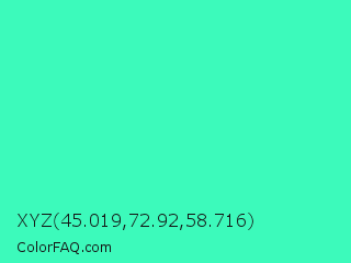 XYZ 45.019,72.92,58.716 Color is a light green color and the nearest color is Turquoise #40e0d0. Hex code #3cfabb and RGB value is rgb(60,250,187). In RGB color space, this color is composed of 24% red, 98% green, 73% blue, In CMYK color space, this color is composed of 76% cyan, 0% magenta, 25% yellow , 2% black , In HSL color space, this color has a hue angle of 160° , 95% saturation and 61% lightness.