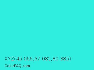 XYZ 45.066,67.081,80.385 Color is a normal cyan color and the nearest color is Turquoise #40e0d0. Hex code #2feedf and RGB value is rgb(47,238,223). In RGB color space, this color is composed of 18% red, 93% green, 87% blue, In CMYK color space, this color is composed of 80% cyan, 0% magenta, 6% yellow , 7% black , In HSL color space, this color has a hue angle of 175° , 85% saturation and 56% lightness.