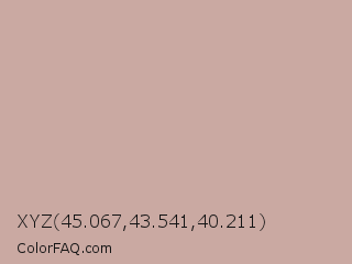 XYZ 45.067,43.541,40.211 Color is a light red color and the nearest color is Eunry #cfa39d. Hex code #caa9a2 and RGB value is rgb(202,169,162). In RGB color space, this color is composed of 79% red, 66% green, 64% blue, In CMYK color space, this color is composed of 0% cyan, 16% magenta, 20% yellow , 21% black , In HSL color space, this color has a hue angle of 11° , 27% saturation and 71% lightness.