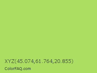XYZ 45.074,61.764,20.855 Color is a light green color and the nearest color is Inchworm #b2ec5d. Hex code #abde61 and RGB value is rgb(171,222,97). In RGB color space, this color is composed of 67% red, 87% green, 38% blue, In CMYK color space, this color is composed of 23% cyan, 0% magenta, 56% yellow , 13% black , In HSL color space, this color has a hue angle of 84° , 65% saturation and 63% lightness.
