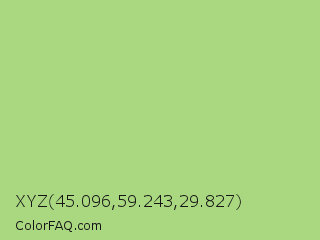 XYZ 45.096,59.243,29.827 Color is a light green color and the nearest color is Feijoa #9fdd8c. Hex code #aad881 and RGB value is rgb(170,216,129). In RGB color space, this color is composed of 67% red, 85% green, 51% blue, In CMYK color space, this color is composed of 21% cyan, 0% magenta, 40% yellow , 15% black , In HSL color space, this color has a hue angle of 92° , 53% saturation and 68% lightness.