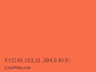 XYZ 45.103,31.394,9.813 Color is a light red color and the nearest color is Outrageous Orange #ff6e4a. Hex code #f76e48 and RGB value is rgb(247,110,72). In RGB color space, this color is composed of 97% red, 43% green, 28% blue, In CMYK color space, this color is composed of 0% cyan, 55% magenta, 71% yellow , 3% black , In HSL color space, this color has a hue angle of 13° , 92% saturation and 63% lightness.