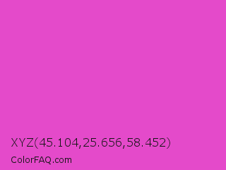 XYZ 45.104,25.656,58.452 Color is a normal magenta color and the nearest color is Purple Pizzazz #fe4eda. Hex code #e44aca and RGB value is rgb(228,74,202). In RGB color space, this color is composed of 89% red, 29% green, 79% blue, In CMYK color space, this color is composed of 0% cyan, 68% magenta, 11% yellow , 11% black , In HSL color space, this color has a hue angle of 310° , 74% saturation and 59% lightness.