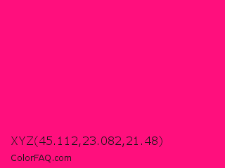 XYZ 45.112,23.082,21.48 Color is a normal rose color and the nearest color is Winter Sky #ff007c. Hex code #ff0f7d and RGB value is rgb(255,15,125). In RGB color space, this color is composed of 100% red, 6% green, 49% blue, In CMYK color space, this color is composed of 0% cyan, 94% magenta, 51% yellow , 0% black , In HSL color space, this color has a hue angle of 333° , 100% saturation and 53% lightness.