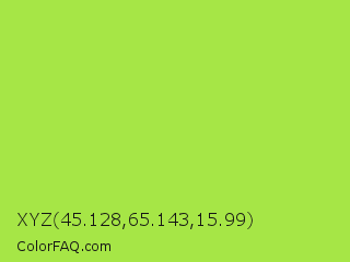 XYZ 45.128,65.143,15.99 Color is a normal green color and the nearest color is Conifer #acdd4d. Hex code #a6e646 and RGB value is rgb(166,230,70). In RGB color space, this color is composed of 65% red, 90% green, 27% blue, In CMYK color space, this color is composed of 28% cyan, 0% magenta, 70% yellow , 10% black , In HSL color space, this color has a hue angle of 84° , 76% saturation and 59% lightness.