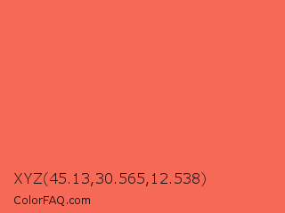XYZ 45.13,30.565,12.538 Color is a light red color and the nearest color is Persimmon #ff6b53. Hex code #f76957 and RGB value is rgb(247,105,87). In RGB color space, this color is composed of 97% red, 41% green, 34% blue, In CMYK color space, this color is composed of 0% cyan, 57% magenta, 65% yellow , 3% black , In HSL color space, this color has a hue angle of 7° , 91% saturation and 65% lightness.