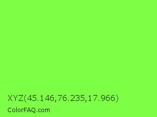 XYZ 45.146,76.235,17.966 Color is a light green color and the nearest color is Spring Frost #87ff2a. Hex code #7cff45 and RGB value is rgb(124,255,69). In RGB color space, this color is composed of 49% red, 100% green, 27% blue, In CMYK color space, this color is composed of 51% cyan, 0% magenta, 73% yellow , 0% black , In HSL color space, this color has a hue angle of 102° , 100% saturation and 64% lightness.