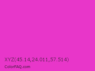 XYZ 45.14,24.011,57.514 Color is a normal magenta color and the nearest color is Razzle Dazzle Rose #ff33cc. Hex code #e836c9 and RGB value is rgb(232,54,201). In RGB color space, this color is composed of 91% red, 21% green, 79% blue, In CMYK color space, this color is composed of 0% cyan, 77% magenta, 13% yellow , 9% black , In HSL color space, this color has a hue angle of 310° , 79% saturation and 56% lightness.