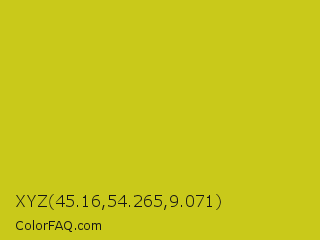 XYZ 45.16,54.265,9.071 Color is a normal yellow color and the nearest color is Key Lime Pie #bfc921. Hex code #c9c91a and RGB value is rgb(201,201,26). In RGB color space, this color is composed of 79% red, 79% green, 10% blue, In CMYK color space, this color is composed of 0% cyan, 0% magenta, 87% yellow , 21% black , In HSL color space, this color has a hue angle of 60° , 77% saturation and 45% lightness.