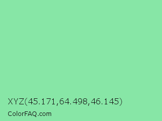 XYZ 45.171,64.498,46.145 Color is a light green color and the nearest color is Teal Deer #99e6b3. Hex code #87e6a6 and RGB value is rgb(135,230,166). In RGB color space, this color is composed of 53% red, 90% green, 65% blue, In CMYK color space, this color is composed of 41% cyan, 0% magenta, 28% yellow , 10% black , In HSL color space, this color has a hue angle of 140° , 66% saturation and 72% lightness.