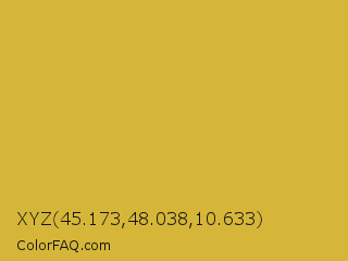 XYZ 45.173,48.038,10.633 Color is a normal yellow color and the nearest color is Gold Metallic #d4af37. Hex code #d6b638 and RGB value is rgb(214,182,56). In RGB color space, this color is composed of 84% red, 71% green, 22% blue, In CMYK color space, this color is composed of 0% cyan, 15% magenta, 74% yellow , 16% black , In HSL color space, this color has a hue angle of 48° , 66% saturation and 53% lightness.