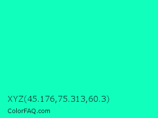 XYZ 45.176,75.313,60.3 Color is a normal green color and the nearest color is Medium Spring Green #00fa9a. Hex code #11ffbd and RGB value is rgb(17,255,189). In RGB color space, this color is composed of 7% red, 100% green, 74% blue, In CMYK color space, this color is composed of 93% cyan, 0% magenta, 26% yellow , 0% black , In HSL color space, this color has a hue angle of 163° , 100% saturation and 53% lightness.
