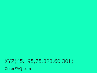 XYZ 45.195,75.323,60.301 Color is a normal green color and the nearest color is Medium Spring Green #00fa9a. Hex code #12ffbd and RGB value is rgb(18,255,189). In RGB color space, this color is composed of 7% red, 100% green, 74% blue, In CMYK color space, this color is composed of 93% cyan, 0% magenta, 26% yellow , 0% black , In HSL color space, this color has a hue angle of 163° , 100% saturation and 54% lightness.