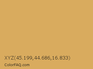 XYZ 45.199,44.686,16.833 Color is a light orange color and the nearest color is Earth Yellow #e1a95f. Hex code #d9ab5e and RGB value is rgb(217,171,94). In RGB color space, this color is composed of 85% red, 67% green, 37% blue, In CMYK color space, this color is composed of 0% cyan, 21% magenta, 57% yellow , 15% black , In HSL color space, this color has a hue angle of 38° , 62% saturation and 61% lightness.
