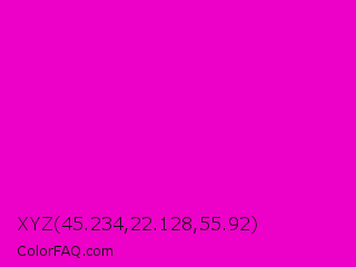 XYZ 45.234,22.128,55.92 Color is a normal magenta color and the nearest color is Purple Pizzazz #ff00cc. Hex code #ed00c7 and RGB value is rgb(237,0,199). In RGB color space, this color is composed of 93% red, 0% green, 78% blue, In CMYK color space, this color is composed of 0% cyan, 100% magenta, 16% yellow , 7% black , In HSL color space, this color has a hue angle of 310° , 100% saturation and 46% lightness.