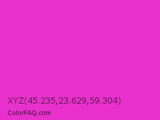 XYZ 45.235,23.629,59.304 Color is a normal magenta color and the nearest color is Razzle Dazzle Rose #ff33cc. Hex code #e830cc and RGB value is rgb(232,48,204). In RGB color space, this color is composed of 91% red, 19% green, 80% blue, In CMYK color space, this color is composed of 0% cyan, 79% magenta, 12% yellow , 9% black , In HSL color space, this color has a hue angle of 309° , 80% saturation and 55% lightness.