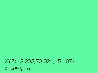 XYZ 45.235,73.324,45.487 Color is a light green color and the nearest color is Medium Aquamarine #66ddaa. Hex code #5efaa1 and RGB value is rgb(94,250,161). In RGB color space, this color is composed of 37% red, 98% green, 63% blue, In CMYK color space, this color is composed of 62% cyan, 0% magenta, 36% yellow , 2% black , In HSL color space, this color has a hue angle of 146° , 94% saturation and 67% lightness.