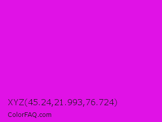 XYZ 45.24,21.993,76.724 Color is a normal magenta color and the nearest color is Phlox #df00ff. Hex code #e012e6 and RGB value is rgb(224,18,230). In RGB color space, this color is composed of 88% red, 7% green, 90% blue, In CMYK color space, this color is composed of 3% cyan, 92% magenta, 0% yellow , 10% black , In HSL color space, this color has a hue angle of 298° , 85% saturation and 49% lightness.