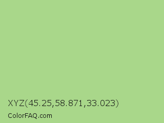 XYZ 45.25,58.871,33.023 Color is a light green color and the nearest color is Feijoa #9fdd8c. Hex code #a9d78a and RGB value is rgb(169,215,138). In RGB color space, this color is composed of 66% red, 84% green, 54% blue, In CMYK color space, this color is composed of 21% cyan, 0% magenta, 36% yellow , 16% black , In HSL color space, this color has a hue angle of 96° , 49% saturation and 69% lightness.