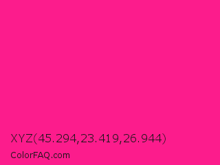 XYZ 45.294,23.419,26.944 Color is a normal rose color and the nearest color is Fluorescent Pink #ff1493. Hex code #fc1c8c and RGB value is rgb(252,28,140). In RGB color space, this color is composed of 99% red, 11% green, 55% blue, In CMYK color space, this color is composed of 0% cyan, 89% magenta, 44% yellow , 1% black , In HSL color space, this color has a hue angle of 330° , 97% saturation and 55% lightness.