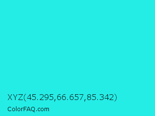 XYZ 45.295,66.657,85.342 Color is a normal cyan color and the nearest color is Loeen #15f2fd. Hex code #24ede6 and RGB value is rgb(36,237,230). In RGB color space, this color is composed of 14% red, 93% green, 90% blue, In CMYK color space, this color is composed of 85% cyan, 0% magenta, 3% yellow , 7% black , In HSL color space, this color has a hue angle of 178° , 85% saturation and 54% lightness.