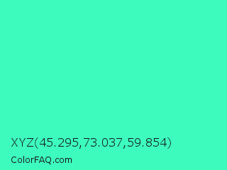 XYZ 45.295,73.037,59.854 Color is a light green color and the nearest color is Turquoise #40e0d0. Hex code #3dfabd and RGB value is rgb(61,250,189). In RGB color space, this color is composed of 24% red, 98% green, 74% blue, In CMYK color space, this color is composed of 76% cyan, 0% magenta, 24% yellow , 2% black , In HSL color space, this color has a hue angle of 161° , 95% saturation and 61% lightness.
