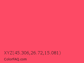 XYZ 45.306,26.72,15.081 Color is a light red color and the nearest color is Magic Potion #ff4466. Hex code #fd4a65 and RGB value is rgb(253,74,101). In RGB color space, this color is composed of 99% red, 29% green, 40% blue, In CMYK color space, this color is composed of 0% cyan, 71% magenta, 60% yellow , 1% black , In HSL color space, this color has a hue angle of 351° , 98% saturation and 64% lightness.