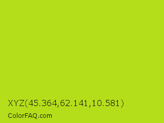 XYZ 45.364,62.141,10.581 Color is a normal lime color and the nearest color is Inch Worm #b0e313. Hex code #b5de1a and RGB value is rgb(181,222,26). In RGB color space, this color is composed of 71% red, 87% green, 10% blue, In CMYK color space, this color is composed of 18% cyan, 0% magenta, 88% yellow , 13% black , In HSL color space, this color has a hue angle of 73° , 79% saturation and 49% lightness.