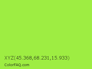 XYZ 45.368,68.231,15.933 Color is a normal green color and the nearest color is Kiwi #8ee53f. Hex code #9eed42 and RGB value is rgb(158,237,66). In RGB color space, this color is composed of 62% red, 93% green, 26% blue, In CMYK color space, this color is composed of 33% cyan, 0% magenta, 72% yellow , 7% black , In HSL color space, this color has a hue angle of 88° , 83% saturation and 59% lightness.