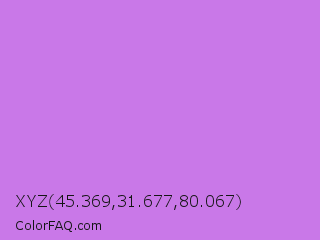 XYZ 45.369,31.677,80.067 Color is a light purple color and the nearest color is French Mauve #d473d4. Hex code #c978e8 and RGB value is rgb(201,120,232). In RGB color space, this color is composed of 79% red, 47% green, 91% blue, In CMYK color space, this color is composed of 13% cyan, 48% magenta, 0% yellow , 9% black , In HSL color space, this color has a hue angle of 283° , 71% saturation and 69% lightness.