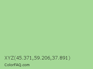 XYZ 45.371,59.206,37.891 Color is a light green color and the nearest color is Granny Smith Apple Crayola #9de093. Hex code #a4d896 and RGB value is rgb(164,216,150). In RGB color space, this color is composed of 64% red, 85% green, 59% blue, In CMYK color space, this color is composed of 24% cyan, 0% magenta, 31% yellow , 15% black , In HSL color space, this color has a hue angle of 107° , 46% saturation and 72% lightness.