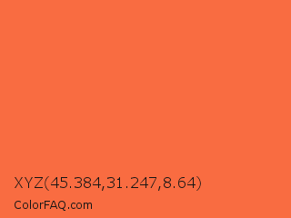 XYZ 45.384,31.247,8.64 Color is a light red color and the nearest color is Smashed Pumpkin #ff6d3a. Hex code #f96c41 and RGB value is rgb(249,108,65). In RGB color space, this color is composed of 98% red, 42% green, 25% blue, In CMYK color space, this color is composed of 0% cyan, 57% magenta, 74% yellow , 2% black , In HSL color space, this color has a hue angle of 14° , 94% saturation and 62% lightness.