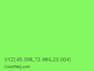 XYZ 45.398,72.984,23.004 Color is a light green color and the nearest color is Screamin Green #66ff66. Hex code #85f861 and RGB value is rgb(133,248,97). In RGB color space, this color is composed of 52% red, 97% green, 38% blue, In CMYK color space, this color is composed of 46% cyan, 0% magenta, 61% yellow , 3% black , In HSL color space, this color has a hue angle of 106° , 92% saturation and 68% lightness.