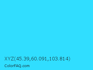 XYZ 45.39,60.091,103.814 Color is a normal cyan color and the nearest color is Loeen #15f2fd. Hex code #30deff and RGB value is rgb(48,222,255). In RGB color space, this color is composed of 19% red, 87% green, 100% blue, In CMYK color space, this color is composed of 81% cyan, 13% magenta, 0% yellow , 0% black , In HSL color space, this color has a hue angle of 190° , 100% saturation and 59% lightness.