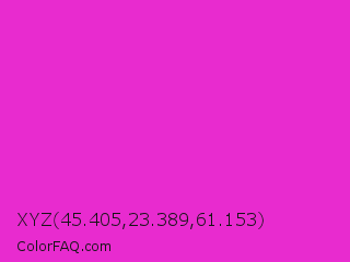 XYZ 45.405,23.389,61.153 Color is a normal magenta color and the nearest color is Razzle Dazzle Rose #ff33cc. Hex code #e82bcf and RGB value is rgb(232,43,207). In RGB color space, this color is composed of 91% red, 17% green, 81% blue, In CMYK color space, this color is composed of 0% cyan, 81% magenta, 11% yellow , 9% black , In HSL color space, this color has a hue angle of 308° , 80% saturation and 54% lightness.