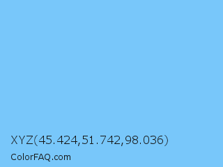 XYZ 45.424,51.742,98.036 Color is a light blue color and the nearest color is Malibu #7dc8f7. Hex code #78c7fa and RGB value is rgb(120,199,250). In RGB color space, this color is composed of 47% red, 78% green, 98% blue, In CMYK color space, this color is composed of 52% cyan, 20% magenta, 0% yellow , 2% black , In HSL color space, this color has a hue angle of 204° , 93% saturation and 73% lightness.