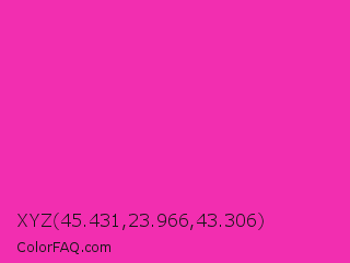 XYZ 45.431,23.966,43.306 Color is a normal magenta color and the nearest color is Frostbite #e936a7. Hex code #f22eb0 and RGB value is rgb(242,46,176). In RGB color space, this color is composed of 95% red, 18% green, 69% blue, In CMYK color space, this color is composed of 0% cyan, 81% magenta, 27% yellow , 5% black , In HSL color space, this color has a hue angle of 320° , 88% saturation and 56% lightness.