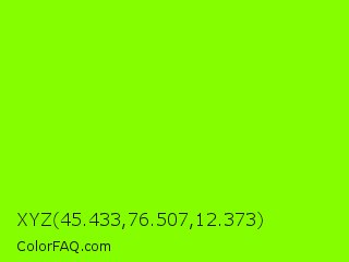 XYZ 45.433,76.507,12.373 Color is a normal green color and the nearest color is Chartreuse #7fff00. Hex code #85ff00 and RGB value is rgb(133,255,0). In RGB color space, this color is composed of 52% red, 100% green, 0% blue, In CMYK color space, this color is composed of 48% cyan, 0% magenta, 100% yellow , 0% black , In HSL color space, this color has a hue angle of 89° , 100% saturation and 50% lightness.