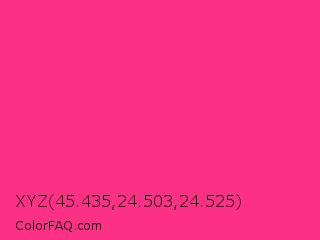 XYZ 45.435,24.503,24.525 Color is a normal rose color and the nearest color is Cerise Pink #ec3b83. Hex code #fc3085 and RGB value is rgb(252,48,133). In RGB color space, this color is composed of 99% red, 19% green, 52% blue, In CMYK color space, this color is composed of 0% cyan, 81% magenta, 47% yellow , 1% black , In HSL color space, this color has a hue angle of 335° , 97% saturation and 59% lightness.