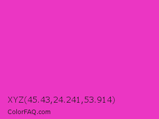 XYZ 45.43,24.241,53.914 Color is a normal magenta color and the nearest color is Razzle Dazzle Rose #ff33cc. Hex code #eb36c3 and RGB value is rgb(235,54,195). In RGB color space, this color is composed of 92% red, 21% green, 76% blue, In CMYK color space, this color is composed of 0% cyan, 77% magenta, 17% yellow , 8% black , In HSL color space, this color has a hue angle of 313° , 82% saturation and 57% lightness.