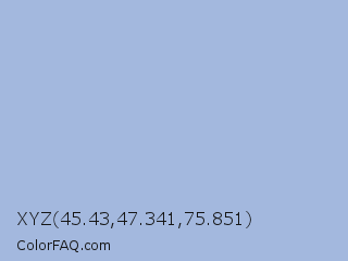 XYZ 45.43,47.341,75.851 Color is a light blue color and the nearest color is Pigeon Post #afbdd9. Hex code #a3b8de and RGB value is rgb(163,184,222). In RGB color space, this color is composed of 64% red, 72% green, 87% blue, In CMYK color space, this color is composed of 27% cyan, 17% magenta, 0% yellow , 13% black , In HSL color space, this color has a hue angle of 219° , 47% saturation and 75% lightness.