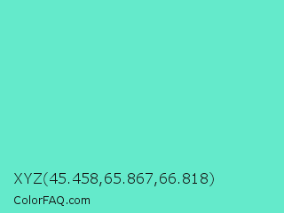 XYZ 45.458,65.867,66.818 Color is a light cyan color and the nearest color is Downy #6fd0c5. Hex code #64eacb and RGB value is rgb(100,234,203). In RGB color space, this color is composed of 39% red, 92% green, 80% blue, In CMYK color space, this color is composed of 57% cyan, 0% magenta, 13% yellow , 8% black , In HSL color space, this color has a hue angle of 166° , 76% saturation and 65% lightness.