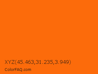 XYZ 45.463,31.235,3.949 Color is a normal orange color and the nearest color is Safety Orange Blaze Orange #ff6700. Hex code #fc6b0b and RGB value is rgb(252,107,11). In RGB color space, this color is composed of 99% red, 42% green, 4% blue, In CMYK color space, this color is composed of 0% cyan, 58% magenta, 96% yellow , 1% black , In HSL color space, this color has a hue angle of 24° , 98% saturation and 52% lightness.