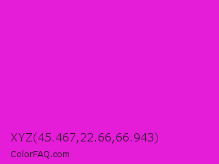 XYZ 45.467,22.66,66.943 Color is a normal magenta color and the nearest color is Hot Magenta #ff1dce. Hex code #e61dd8 and RGB value is rgb(230,29,216). In RGB color space, this color is composed of 90% red, 11% green, 85% blue, In CMYK color space, this color is composed of 0% cyan, 87% magenta, 6% yellow , 10% black , In HSL color space, this color has a hue angle of 304° , 80% saturation and 51% lightness.